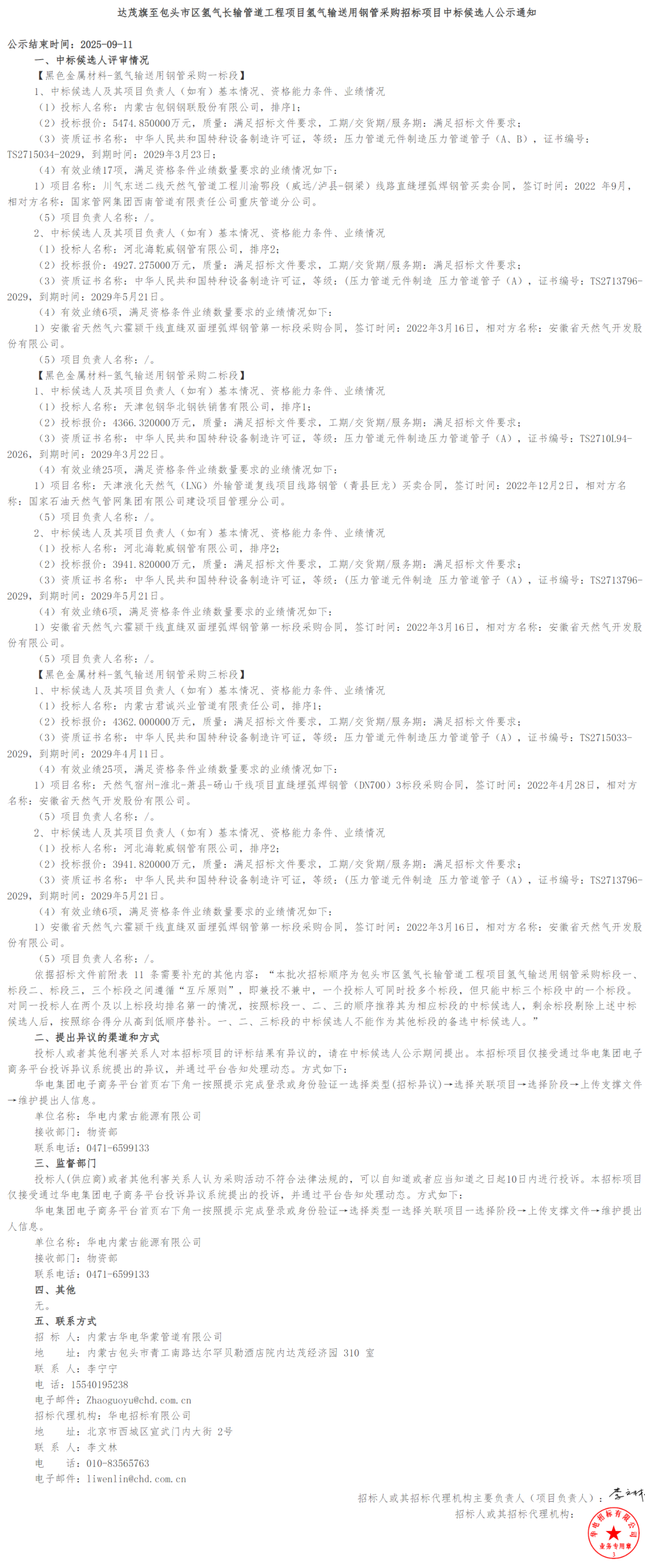 氢气输送用钢管采购中,分为3个标段,内蒙古包钢钢联股份有限公司、天津包钢华北钢铁销售有限公司、内蒙古君诚兴业管道有限责任公司3家作为第一中标候选人入选。