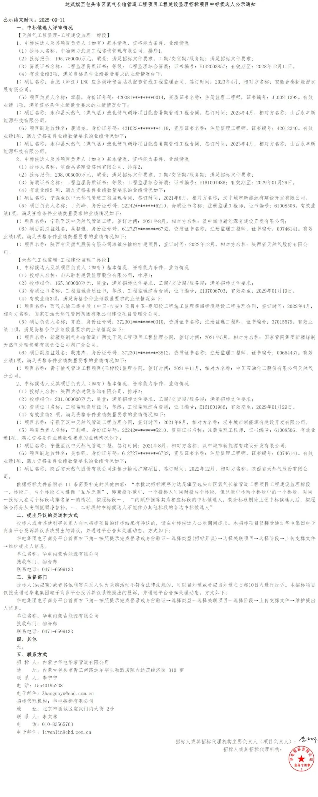 新能源圈获悉,9月8日,华电集团新能源产业相关项目工程达茂旗至包头市区氢气长输管道工程项目管道施工总承包及氢气输送用钢管采购、工程建设监理中标候选人公示。