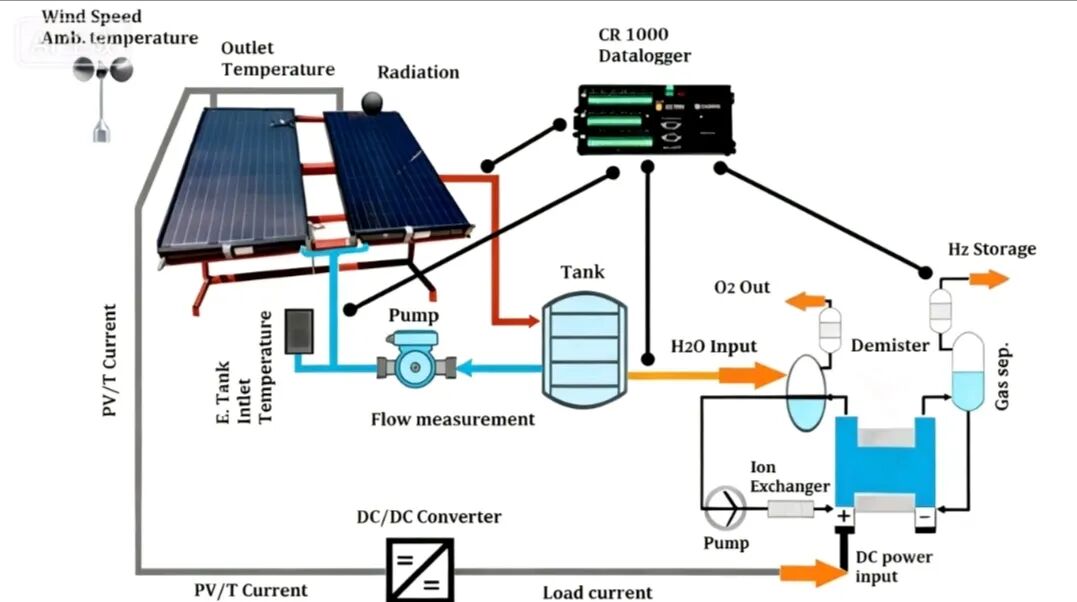 该系统结合了光伏发电与集热功能,由PV/T板、DC/DC变换器和PEM电解槽组成。PV/T系统为电解槽提供电流并预热进水。利用PEM电解槽(PEMEC)进行的年度测试数据对比了纯PV系统与PV/T系统的月产氢量,表明PV/T系统因热能利用具有优势。