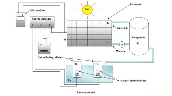 该系统利用光伏(PV)电池产生的电能驱动电解槽分解水。其核心原理如图所示: