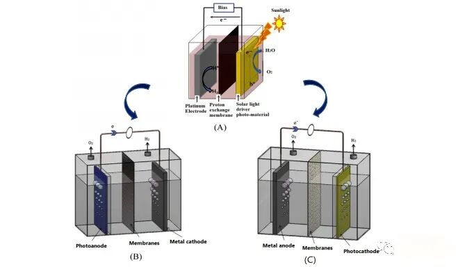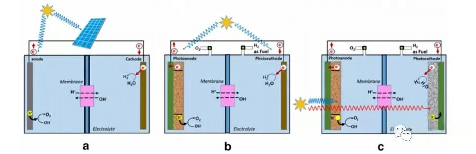 图9:PEC电池的原理(a);光阳极带金属阴极(B);光电阴极带金属阳极(C)