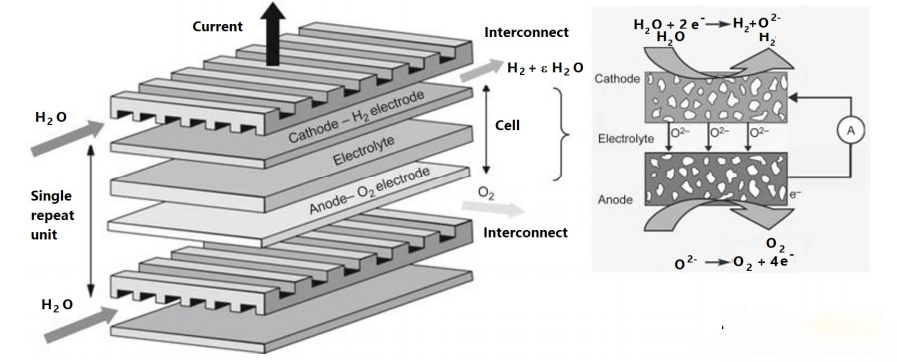 与低温水电解相比,高温(通常>700°C)蒸汽(H₂O(g))电解(HTSE)所需电能更低,部分能量由热能提供,从而降低成本和提升效率。核心部件是固体氧化物电解池(SOEC)(图12),由致密电解质(氧离子导体)和两侧的多孔电极(H₂侧阴极,O₂侧阳极)组成陶瓷三层结构。