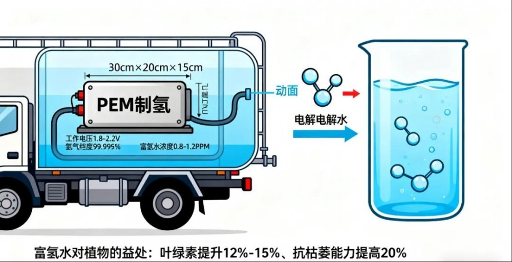除氢动力系统外,这款洒水车的另一大创新亮点,在于水罐内集成了微型 PEM(质子交换膜)电解水模块 —— 打破传统洒水车 “只补水、不养护” 的局限,通过电解水产生氢气并原位溶解于灌溉水中,生成浓度稳定在 0.8-1.2ppm 的富氢水,让灌溉过程兼具 “补水” 与 “滋养” 双重功能,为园林养护提供全新技术路径。