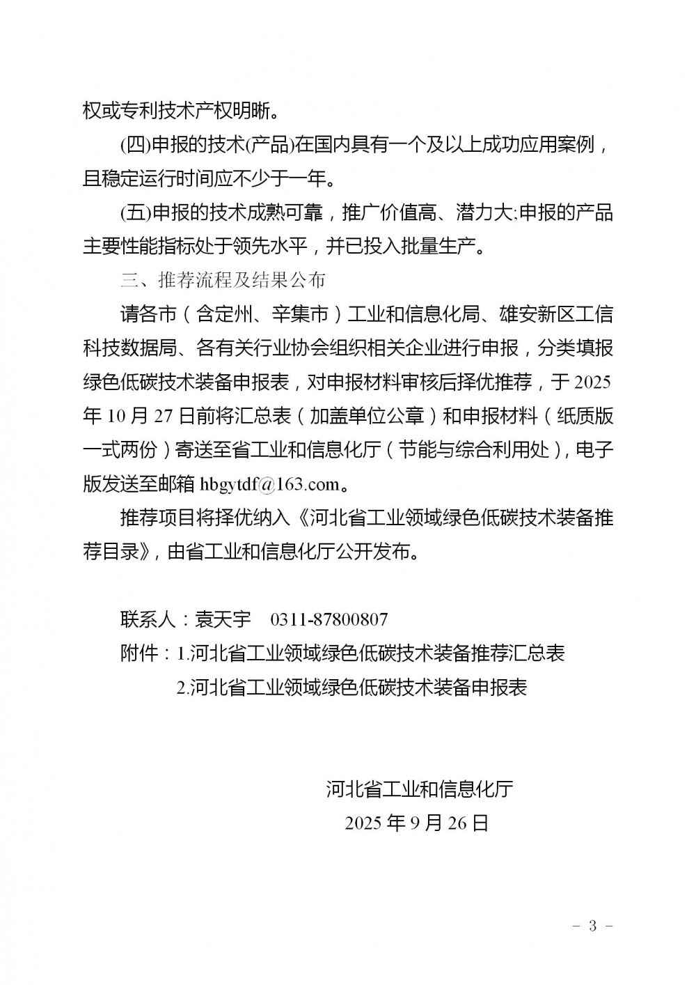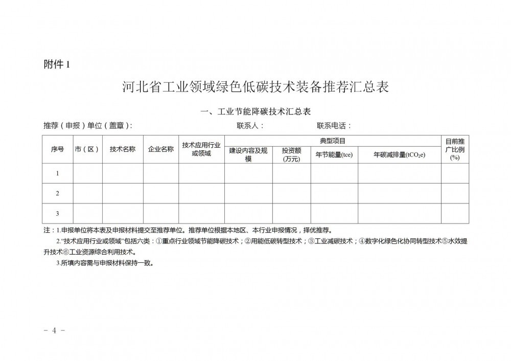 请各市(含定州、辛集市)工业和信息化局、雄安新区工信科技数据局、各有关行业协会组织相关企业进行申报,分类填报绿色低碳技术装备申报表,对申报材料审核后择优推荐,于2025年10月27日前将汇总表(加盖单位公章)和申报材料(纸质版一式两份)寄送至省工业和信息化厅(节能与综合利用处),电子版发送至邮箱hbgytdf@163.com。