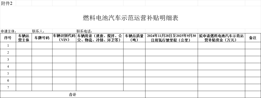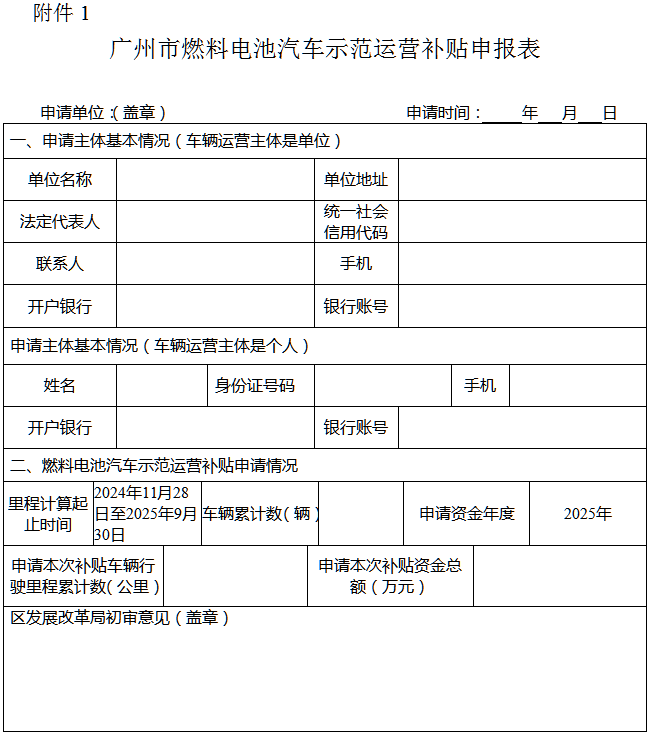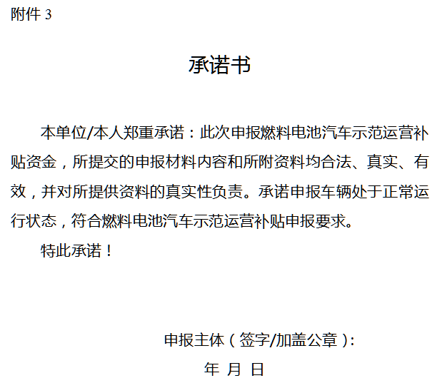 (一)《燃料电池汽车示范运营补贴申报表》《燃料电池汽车示范运营补贴明细表》《承诺书》(见附件,材料电子版本可在广州市发展和改革委员会网站通知公告栏下载)。