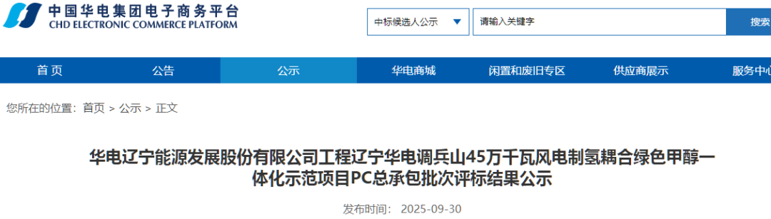华电辽宁能源有限公司辽宁华电调兵山45万千瓦风电制氢耦合绿色甲醇一体化示范项目PC总承包项目中标候选人公示通知
