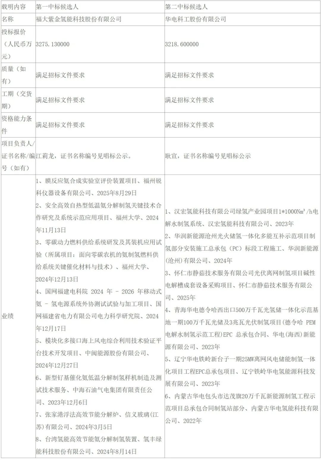 中标候选人第一名为福大紫金氢能科技股份有限公司,投标报价为3275.13万元;
