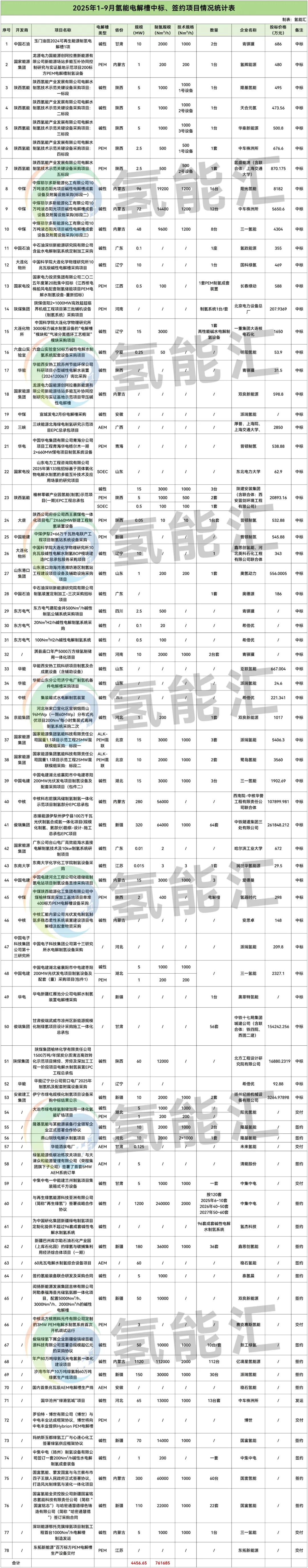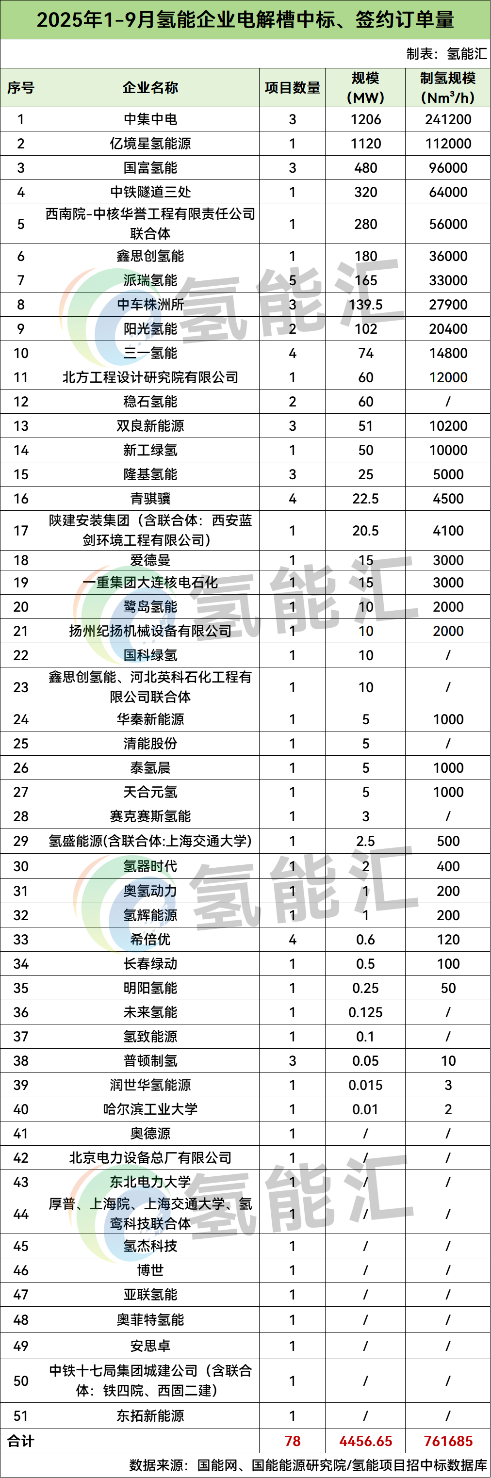 新能源圈根据公开信息不完全统计,2025年1-9月,共有78个氢能电解槽中标、签约项目,规模累计4456.65MW,制氢规模累计761685Nm³/h。