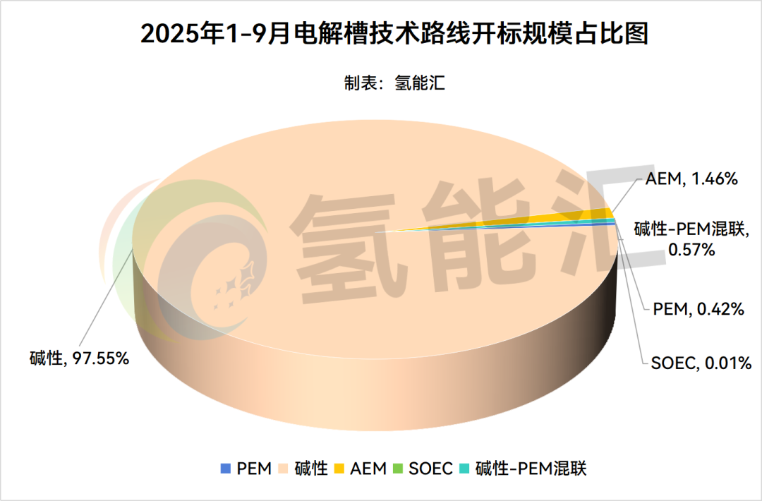 新能源圈通过梳理2025年1-9月氢能中标、签约项目技术路线,包括碱性、AEM、PEM、SOEC、碱性-PEM混联5种技术路线。