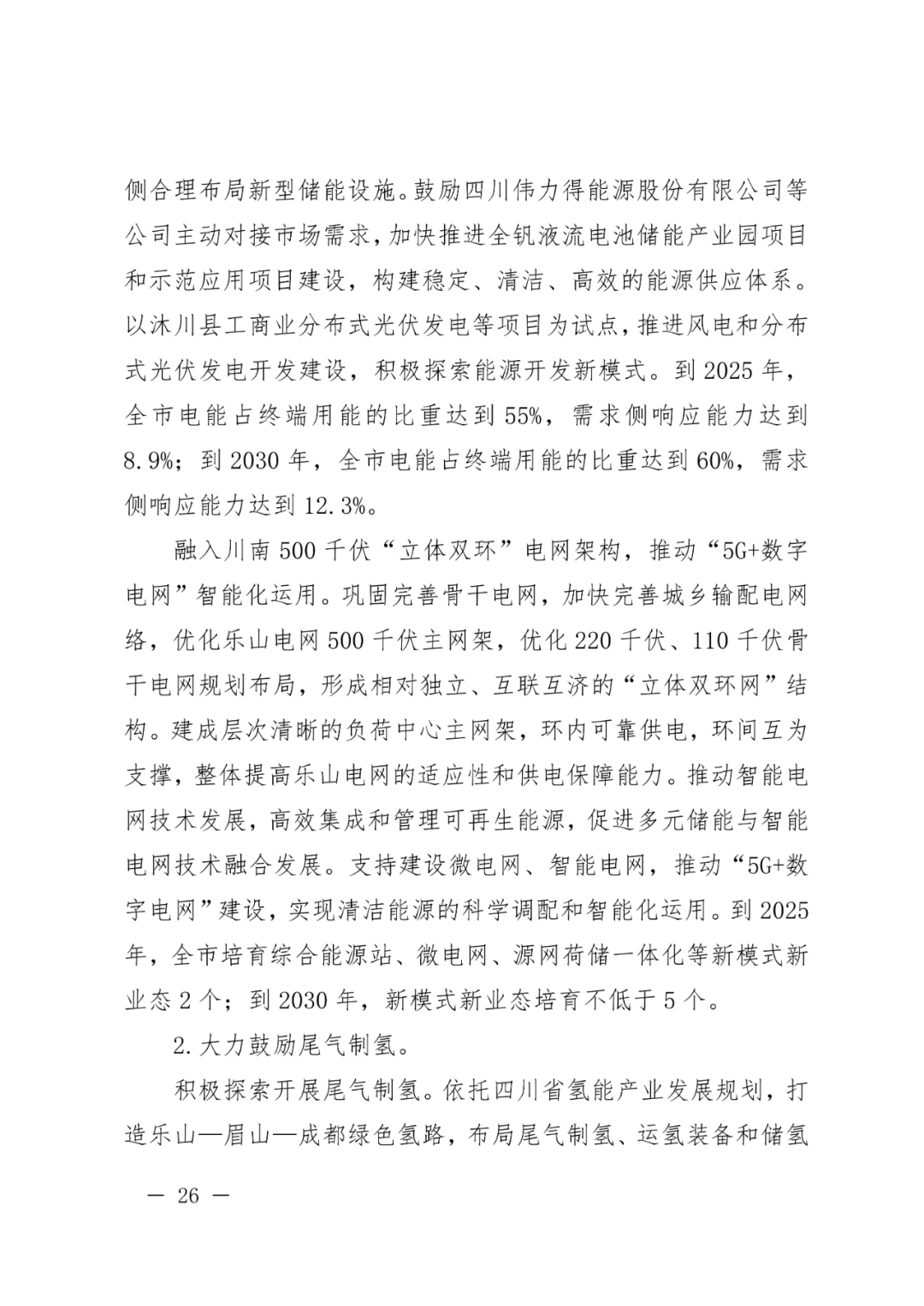 依托工业副产氢优势,培育尾气制氢、氢燃料电池及其关键零部件技术创新示范基地。加快五通桥区、峨眉山市和马边彝族自治县配套加氢站建设,鼓励利用现有加油(气)站、充电站以及综合供能服务站等场址实施加氢站改扩建工程。加快完善城乡公共充(换)电网络布局,探索推动物流场站、公路沿线等加氢站布局,完善城乡低碳运输装备清洁能源配套设施体系。