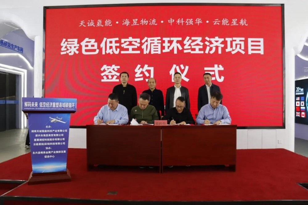 研讨会最后湖南天诚氢能、资兴海昱商贸、中科强华、云能星航四方举行了签约仪式,各方代表在与会嘉宾的见证下签署合作协议,标志着这一创新模式从理论探讨迈向实践应用的新阶段。此次签约将进一步促进各方在技术研发、产业应用等方面的深度合作,为县域绿色低碳发展提供可复制、可推广的实践案例。