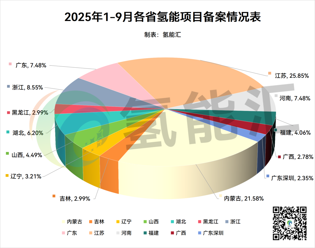 新能源圈根据公开信息不完全统计,2025年1-9月全国各省完成备案的氢能项目共计469个,投资总计20150319.501万元(约2015.03亿元),规模总计15312MW,制氢规模总计3012400Nm³/h。