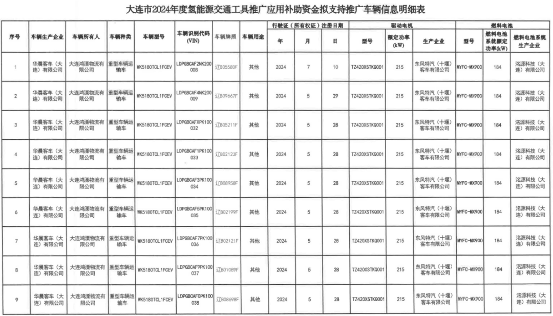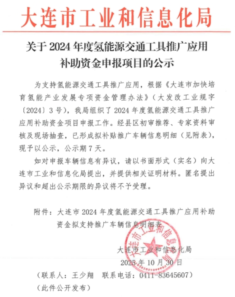 新能源圈获悉,近日,大连市工业和信息化局发布《关于2024年度氢能源交通工具推广应用补助资金申报项目的公示》。
