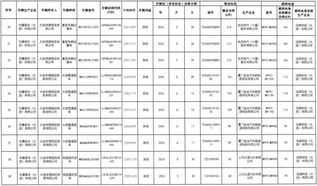 车辆种类涉及重型车辆运输车、大型普通客车、轻型厢式货车、燃料电池大中型客车、燃料电池洗扫车、燃料电池吸尘车。