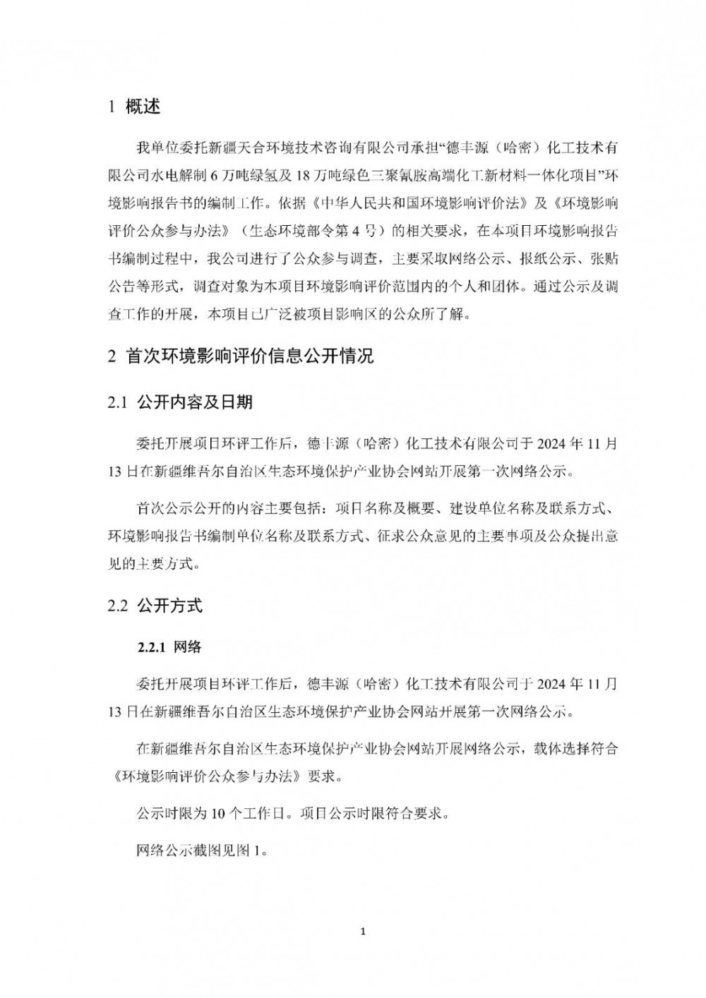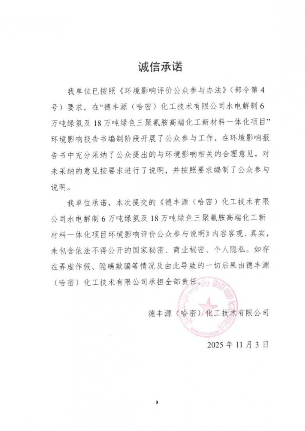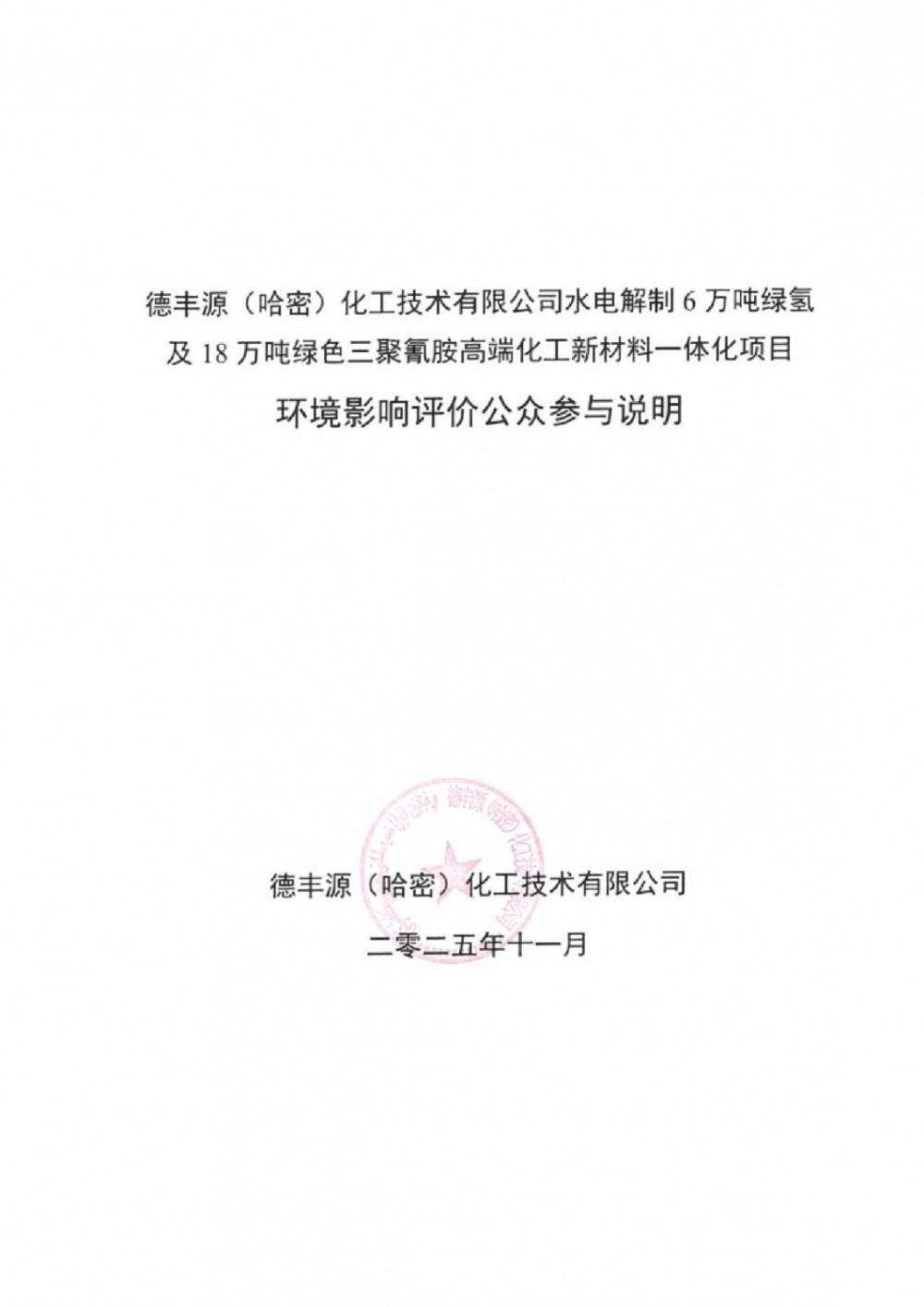 我单位委托新疆天合环境技术咨询有限公司承担“德丰源(哈密)化工技术有限公司水电解制6万吨绿氢及18万吨绿色三聚氰胺高端化工新材料一体化项目”环境影响报告书的编制工作。目前,拟报批的环境影响报告书全文和公众参与说明已编制完成。根据《中华人民共和国环境影响评价法》及《环境影响评价公众参与办法》(生态环境部令第4号)的要求,对本项目拟报批的环境影响报告书全文和公众参与说明进行拟报批公示。公示材料如下: