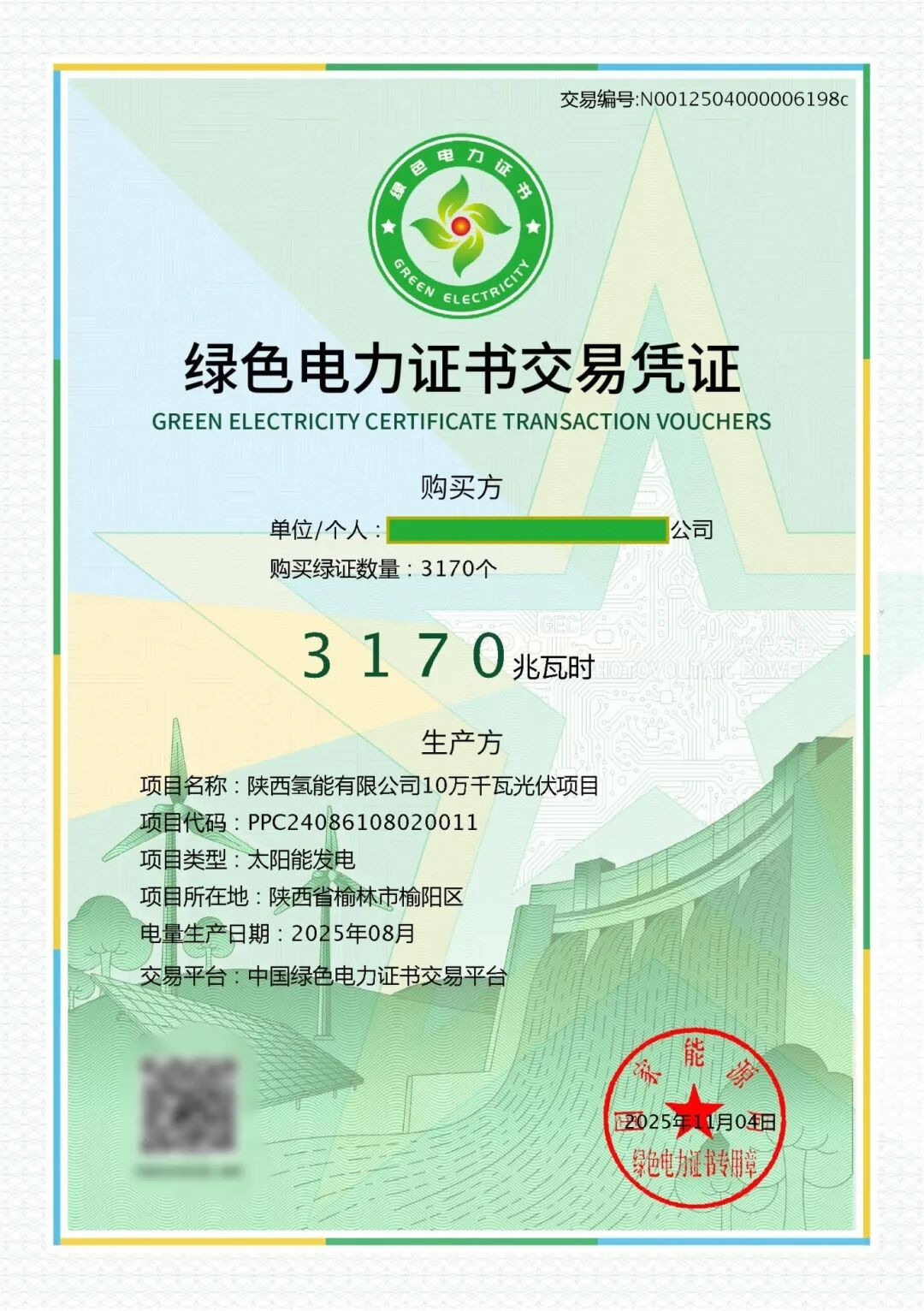 近日,陕西氢能新能源有限公司成功向客户交付1.7万张绿色电力证书并完成资金结算,顺利达成首笔绿证交易。此次交易的绿证来源于陕西氢能氢丰光伏电站100MW项目2025年所产生的绿色电力,标志着公司在绿证交易领域实现“零的突破”。