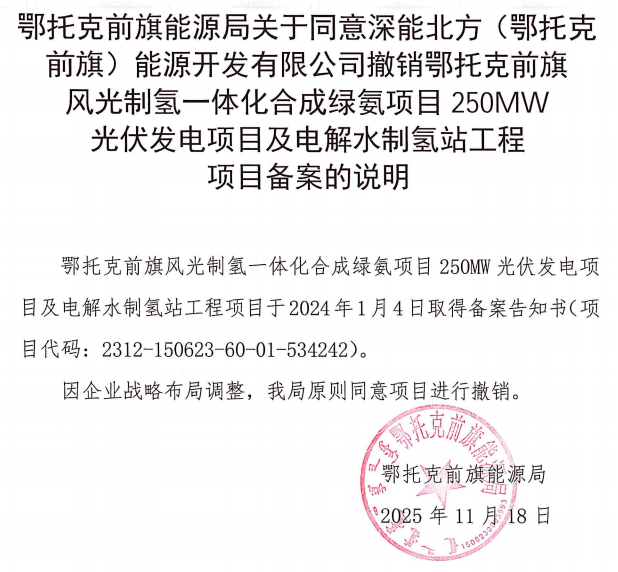 新能源圈获悉,近日,鄂托克前旗能源局关于同意深能北方(鄂托克前旗)能源开发有限公司撤销鄂托克前旗风光制氢一体化合成绿氨项目250MW光伏发电项目及电解水制氢站工程项目备案的说明。