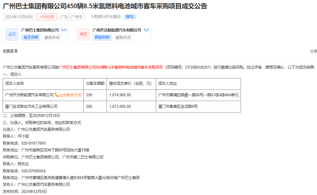 根据公告,成交人为广州开沃新能源汽车有限公司和厦门金龙联合汽车工业有限公司,采购数量为450辆,中标总金额为48332.5万元(约4.83亿元)。
