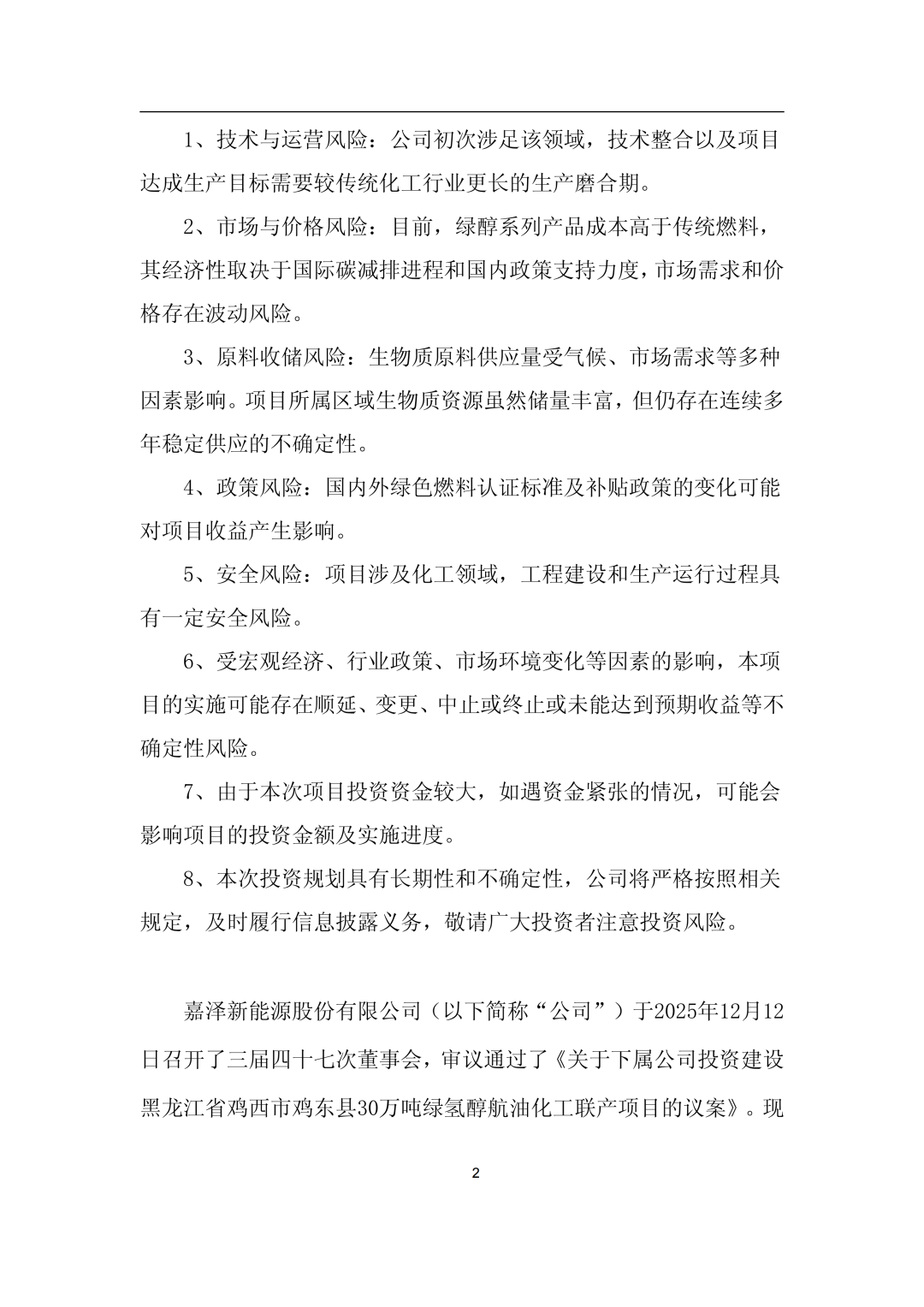 嘉泽新能于2025年12月12日召开了三届四十七次董事会,审议通过了《关于下属公司投资建设黑龙江省鸡西市鸡东县30万吨绿氢醇航油化工联产项目的议案》,尚需公司股东会审议批准。