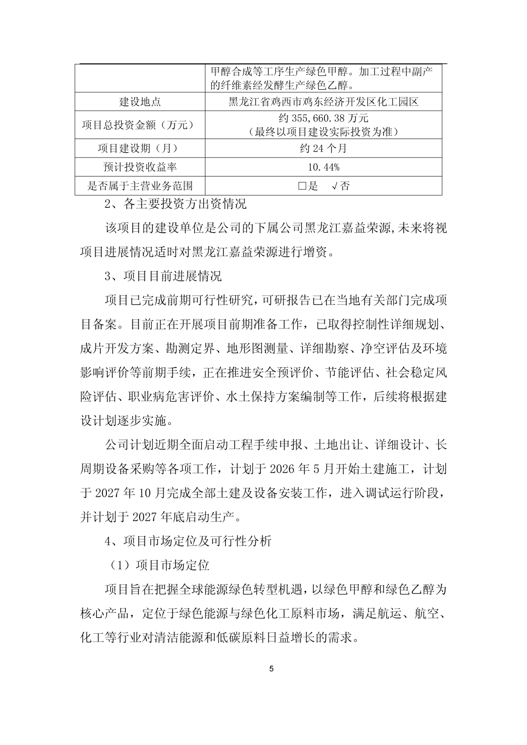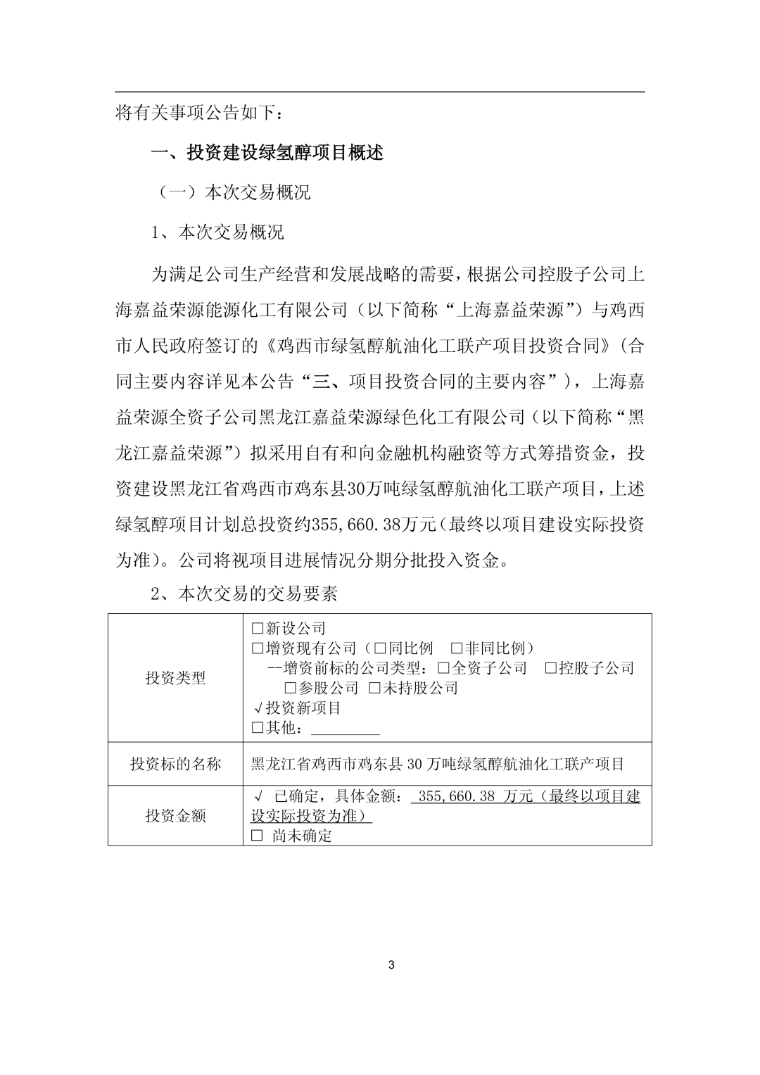 公告称,为满足公司生产经营和发展战略的需要,根据公司控股子公司上海嘉益荣源能源化工有限公司(以下简称“上海嘉益荣源”)与鸡西市人民政府签订的《鸡西市绿氢醇航油化工联产项目投资合同》,上海嘉益荣源全资子公司黑龙江嘉益荣源绿色化工有限公司(简称“黑龙江嘉益荣源”)拟采用自有和向金融机构融资等方式筹措资金,投资建设黑龙江省鸡西市鸡东县30万吨绿氢醇航油化工联产项目,上述绿氢醇项目计划总投资约355,660.38万元。