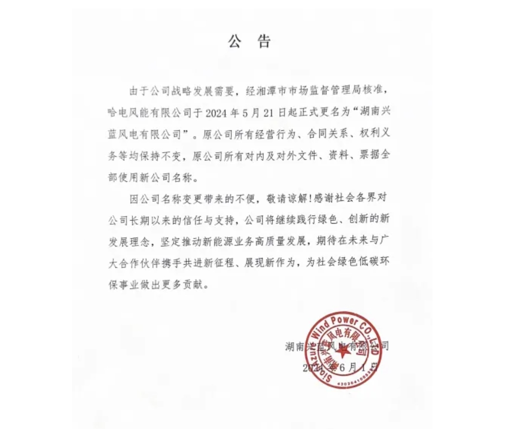 6月4日,哈电风能发布消息称,由于公司战略发展需要,经湘潭市市场监督管理局核准,哈电风能有限公司于2024年5月21日起正式更名为湖南兴蓝风电有限公司。原公司所有经营行为、合同关系、权利义务等均保持不变,原公司所有对内及对外文件、资料、票据全部使用新公司名称。