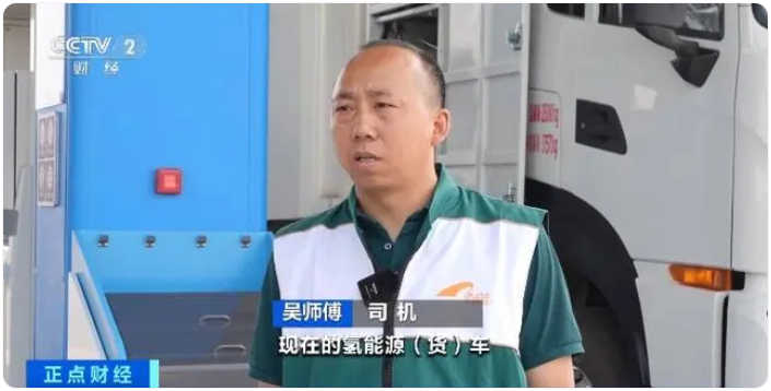 司机 吴师傅:我以前开的是49吨燃油重卡,现在的氢能源货车舒适感比较好、没有污染、噪音低。正常加氢十分钟左右,加完续航300公里左右。驾驶这种车体验感非常好。