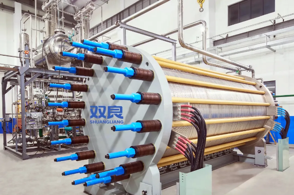 在氢能方面,双良绿电智能制氢系统采用完全自主设计制造的压力容器、BOP装置和催化剂等核心部件,产品更专业;电解槽应用本安式设计,耐腐蚀性提升50%,多重保险,永不漏碱,产品更安全;拥有独特的极板结构,增加电极与极板间的可利用面积,降低接触电阻,增加流场扰动,减少涡流死区,产品更长寿;采用先进的隔膜、催化剂及结构技术,最低运行负荷10%,热启动时间小于20s,产品更低耗;采用Wonder Cloud/OS数字化平台+AI算法+AIOT终端一体化系统技术,产品更智能。