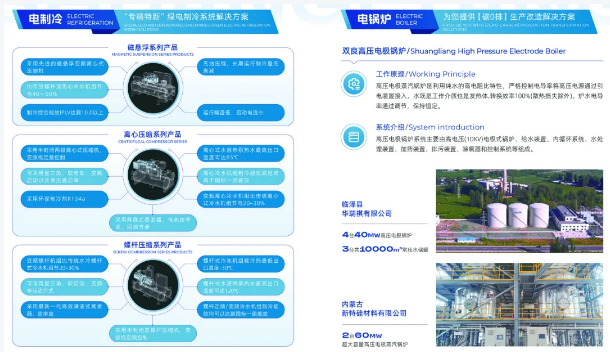 在电能应用领域,双良电制冷、电锅炉等产品不断推陈出新,更加适应绿电应用场景。其中磁悬浮系列电制冷产品,比传统螺杆或离心冷水机组节电40%~50%;离心压缩系列电制冷产品,比传统离心式冷水机组节电20%~30%;螺杆压缩系列电制冷产品,比传统水冷螺杆式机组节电20%~30%。电锅炉利用纯水的高电阻比特性,严格控制电导率,转换效率可达100%(散热损失除外),炉水电导率通过调节可保持恒定,有效提升蒸汽品质。