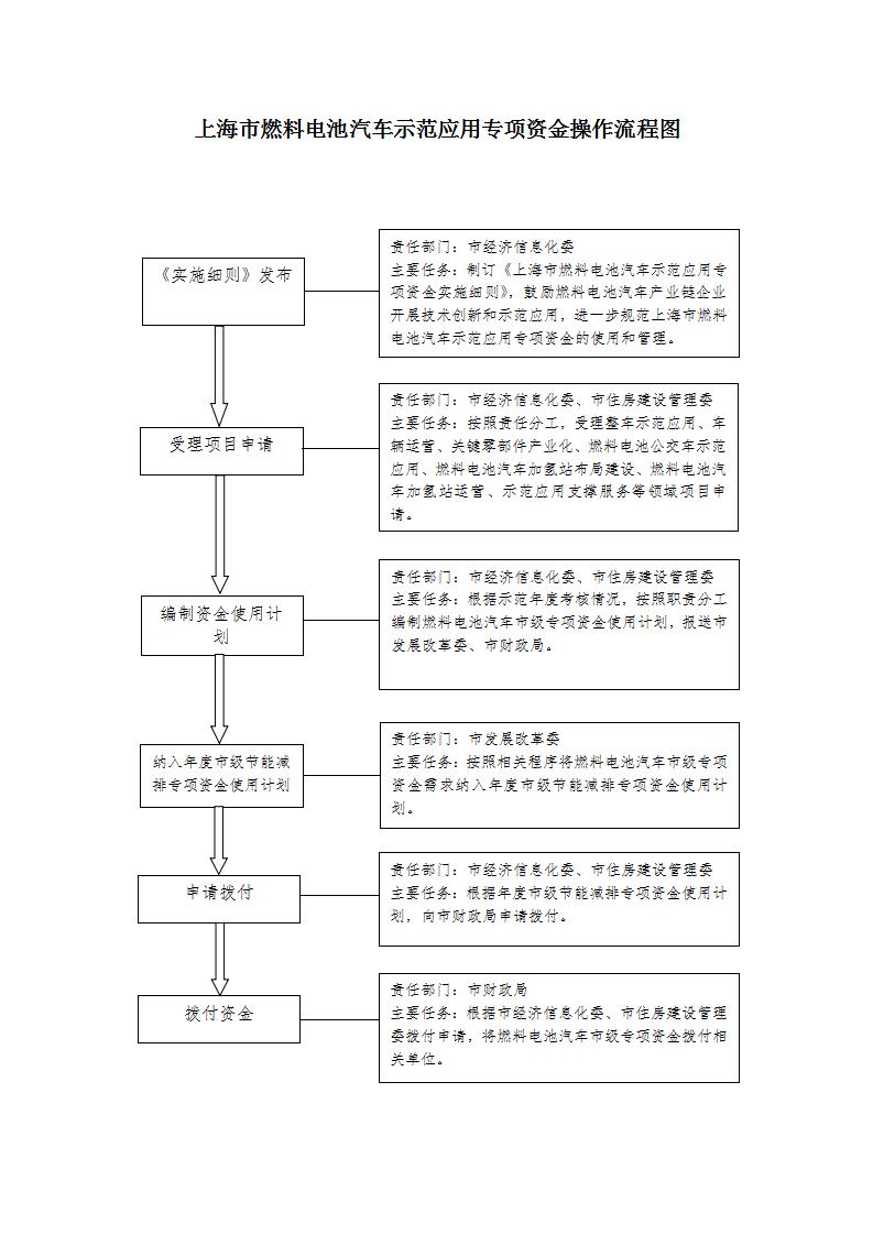 上海市经济和信息化委员会(以下简称市经济信息化委)负责统筹本市燃料电池汽车示范应用工作,以及整车示范应用、车辆运营、关键零部件产业化、示范应用支撑服务等领域专项资金的具体协调及推进实施。