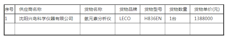 据悉,该公告内容明确指出,项目名称为氢元素分析仪(进口),中标(成交)供应商为沈阳兴岛科学仪器有限公司,中标(成交)金额为138.8000000万元,主要货物为1台LECO氢元素分析仪。