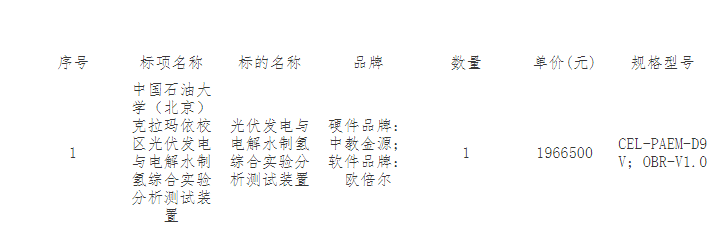 据新能源圈了解到,近日,中国石油大学(北京)克拉玛依校区光伏发电与电解水制氢综合实验分析测试装置中标(成交)结果公告公布。