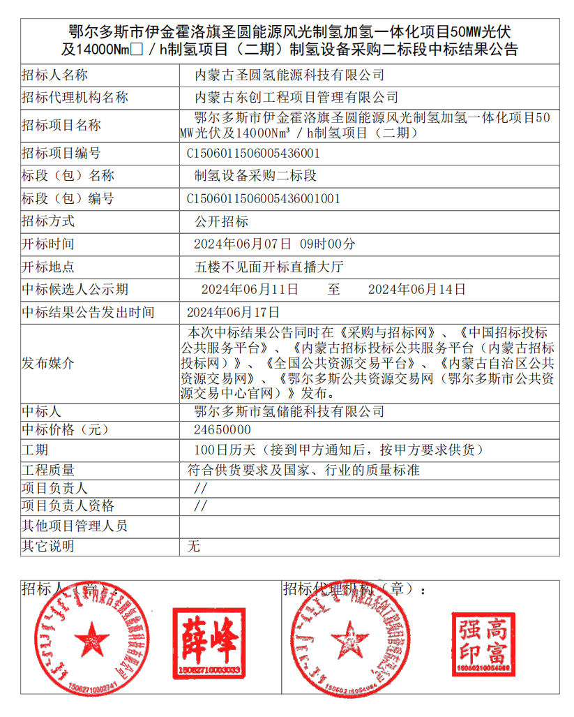 据悉,该公告内容明确指出,招标人为内蒙古圣圆氢能源科技有限公司,项目名称为鄂尔多斯市伊金霍洛旗圣圆能源风光制氢加氢一体化项目50MW光伏及14000Nm3/h制氢项目(二期),制氢设备采购一标段中标人为中船(邯郸)派瑞氢能科技有限公司,中标价格为39965200元。制氢设备采购二标段中标人为鄂尔多斯市氢储能科技有限公司,中标价格为24650000元。