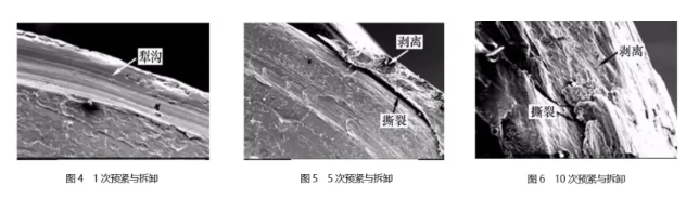 (3)10次预紧与拆卸后,黏着磨损加剧,螺牙顶部发生撕裂和剥离的材料体积增加。(图6)