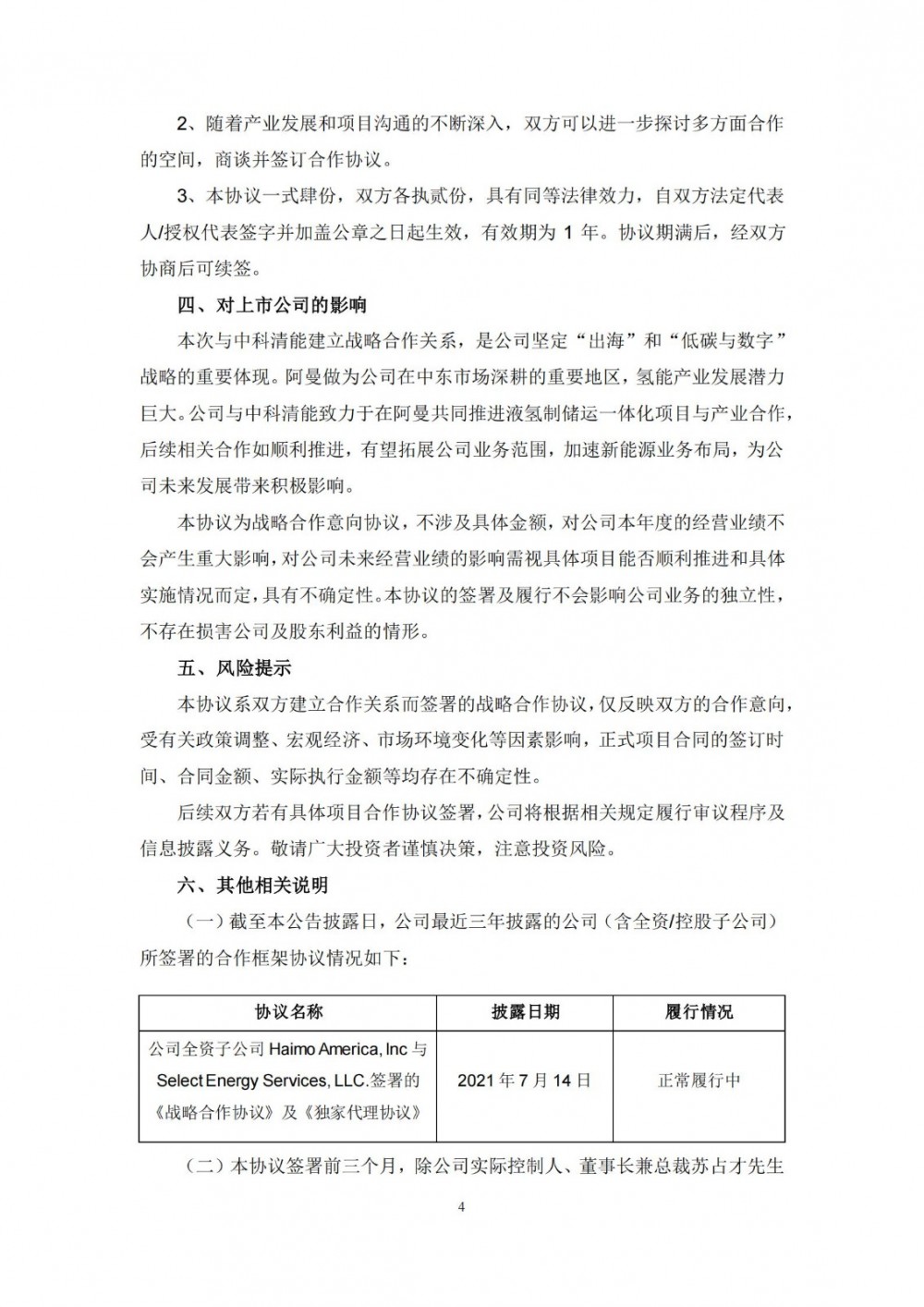 据新能源圈了解到,6月20日,海默科技发布公告称,公司与河南中科清能科技有限公司(以下简称“中科清能”)根据相关法律法规的规定,本着“相互尊重、密切合作、优势互补、创新发展、互利共赢”的精神,经友好协商,达成《河南中科清能科技有限公司与海默科技(集团)股份有限公司阿曼氢能产业项目战略合作协议》(以下简称“《战略合作协议》,协议有效期为1年。