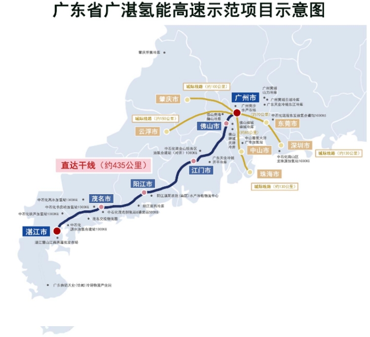 广湛氢能高速示范项目涵盖广州、佛山、东莞、江门、阳江、湛江、茂名等地,辐射珠三角地区。此区域由沈海高速、汕湛高速、207国道、228国道和325国道组成交通大网络,是全省水产品、生鲜肉类、果蔬冷链运输的大动脉,沿线分布了各类大型批发市场和冷库,加氢站布局合理,氢源保障潜力较大,具备发展燃料电池汽车冷链物流的良好条件。
