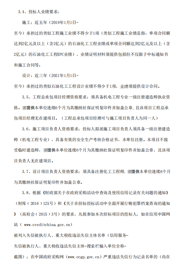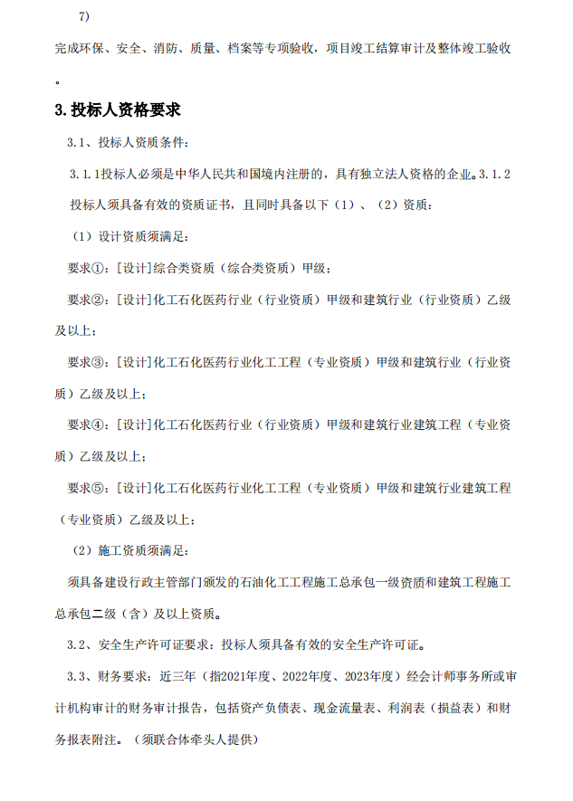 及以上;[设计]化工石化医药行业化工工程(专业资质)甲级和建筑行业(行业资质)乙级及以上;[设计]化工石化医药行业(行业资质)甲级和建筑行业建筑工程(专业资质)乙级及以上;[设计]化工石化医药行业化工工程(专业资质)甲级和建筑行业建筑工程(专业资质)乙级及以上。