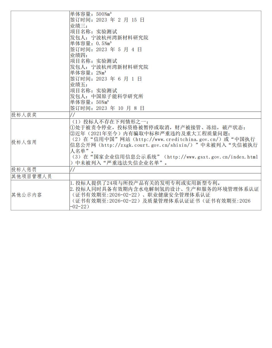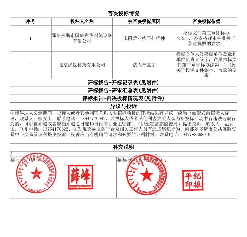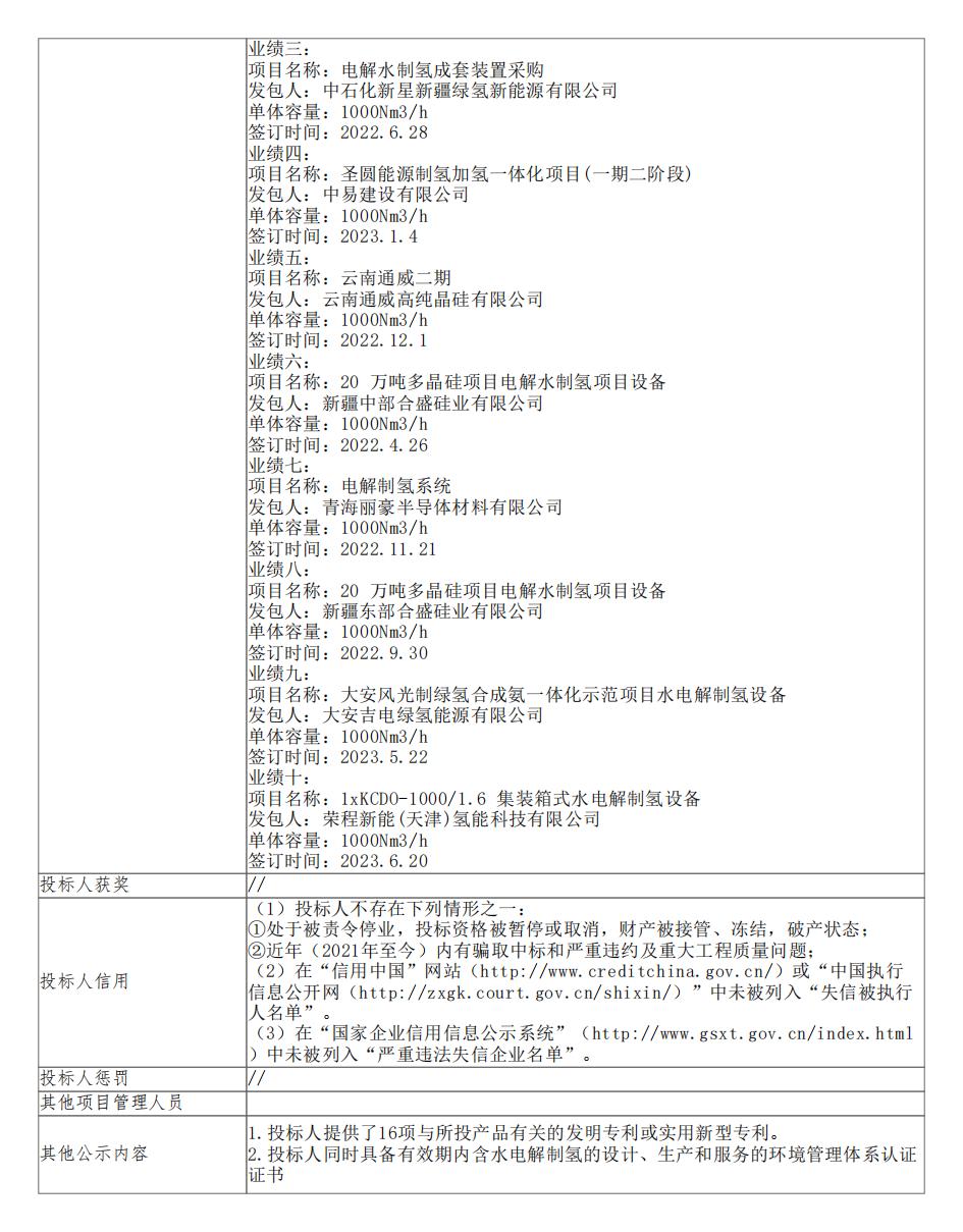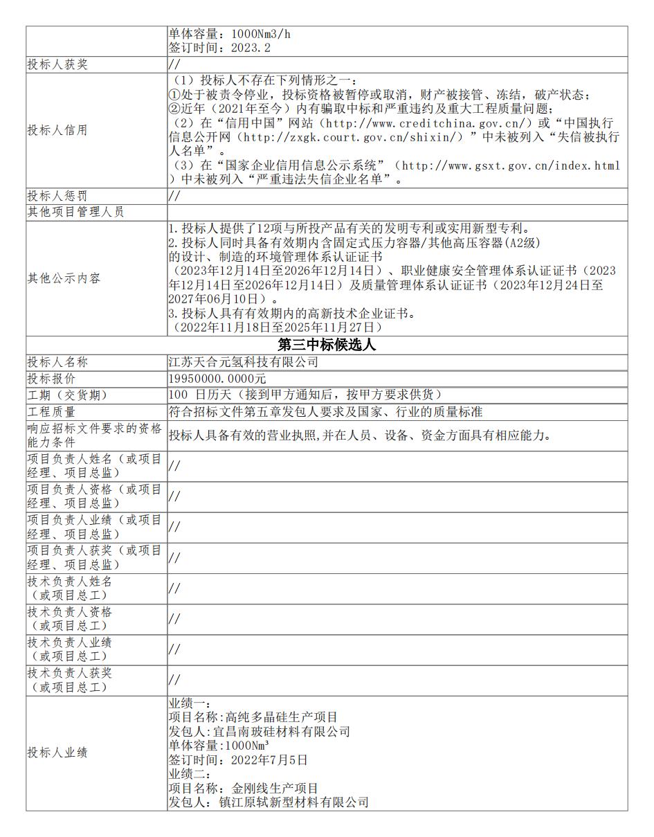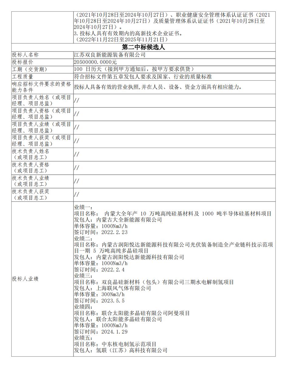 中标公告指出,第一中标候选人为中船(邯郸)派瑞氢能科技有限公司,投标报价为20882000.00元;第二中标候选人为江苏双良新能源装备有限公司,投标报价为20500000.00元;第三中标候选人为江苏天合元氢科技有限公司,投标报价为19950000.00元。