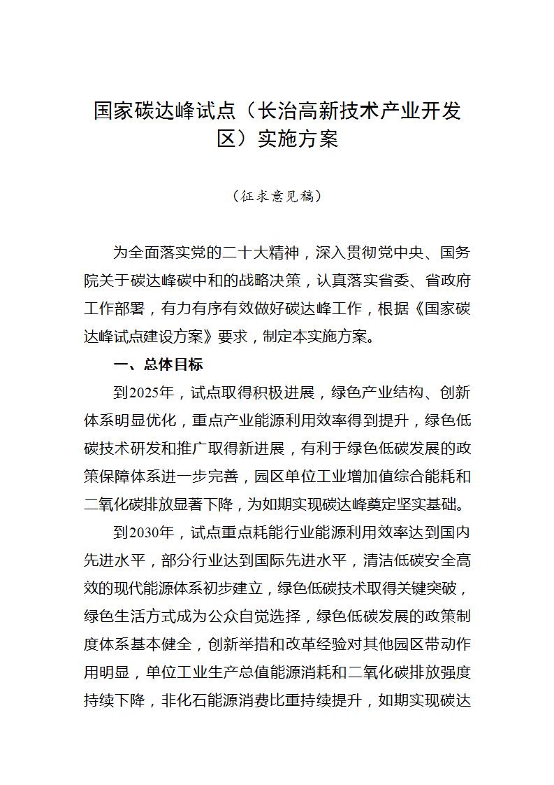 据新能源圈了解到,近日,长治市发展和改革委员会发布关于向社会公开征求对《国家碳达峰试点(长治高新技术产业开发区)实施方案(征求意见稿)》意见的通知。