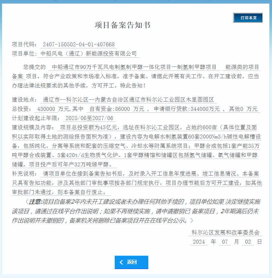 据新能源圈了解到,2024年7月2日,中船通辽市90万千瓦风电制氢制甲醇项目获准备案。