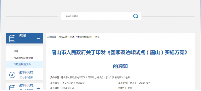 唐山市人民政府印发《国家碳达峰试点(唐山)实施方案》的通知,明确指出: