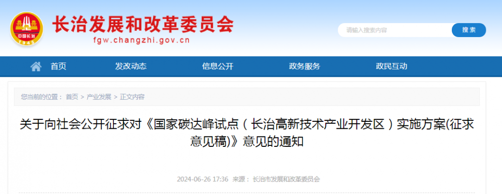 近日,长治市发展和改革委员会发布关于向社会公开征求对《国家碳达峰试点(长治高新技术产业开发区)实施方案(征求意见稿)》意见的通知。