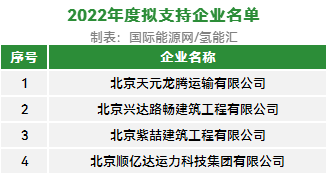 近日,北京市大兴区人民政府发布了关于《大兴区促进氢能产业发展暂行办法(2022年修订版)》2023年度及2022年度“支持车辆高效运营”拟支持名单的公示。其中,21家企业入围2023年度名单,4家企业入围2022年度名单。