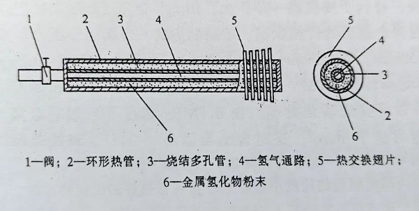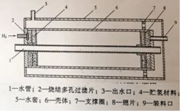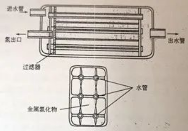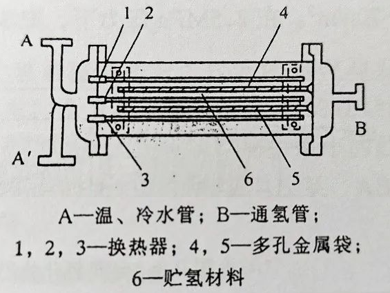 当向2块多孔板组成的小隔室内导入氢气时,氢沿着整个多孔板的板面向吸氢合金内扩散,并被储存起来,产生的热量经多孔板对面的加热冷却器排走。放氢时,通过加热冷却器加热合金层,氢通过多孔板向外流出。(特点:合金层的厚度总保持一定,在吸收和释放氢过程中没有任何传热损失)