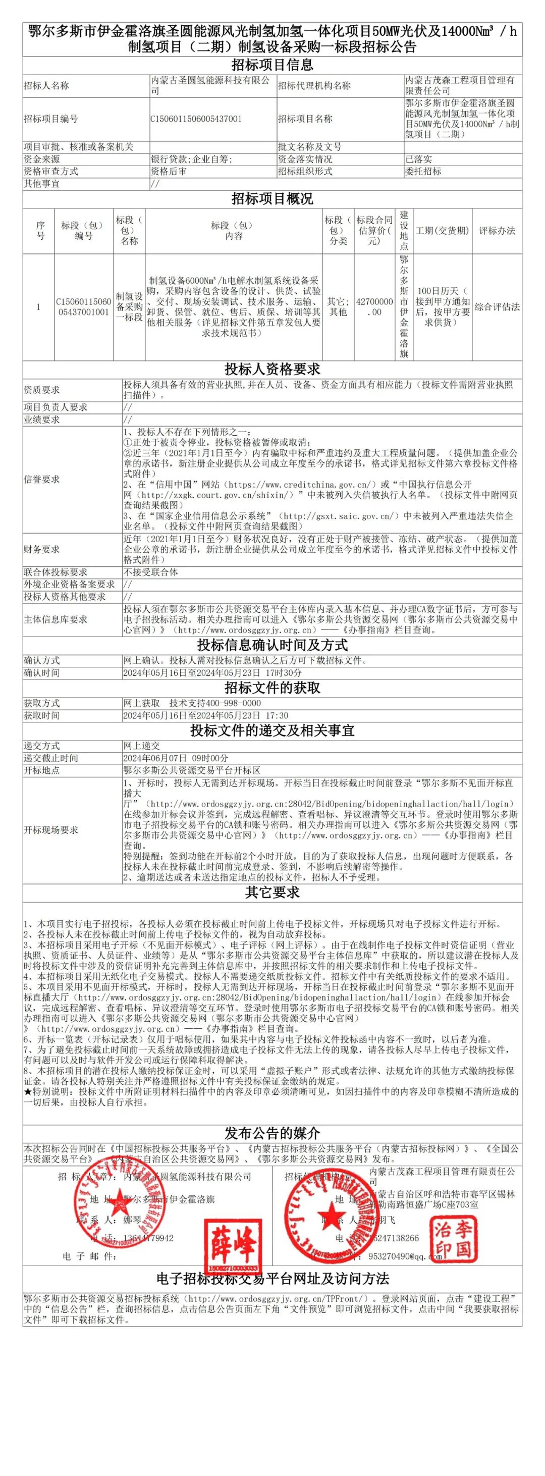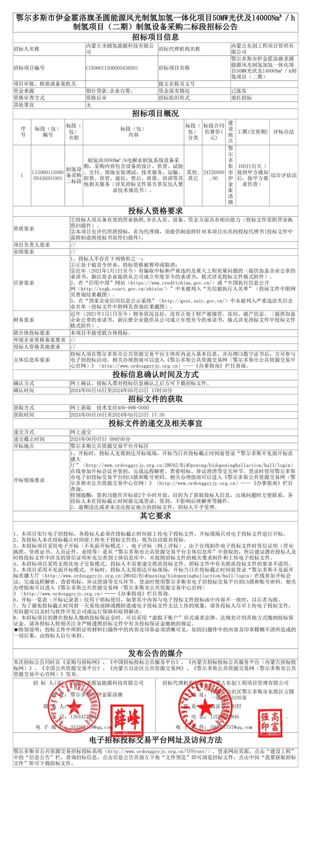 5月16日,鄂尔多斯市伊金霍洛旗圣圆能源风光制氢加氢一体化项目50MW光伏及14000N制氢项目(二期)制氢设备采购两个标段招标公告发布。