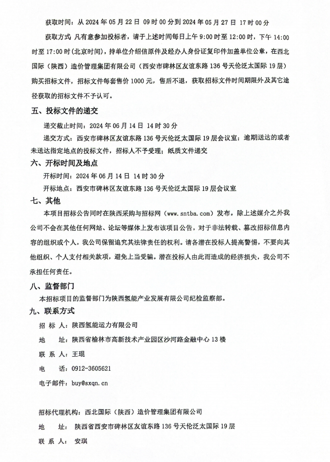2024-04-30 据新能源圈了解到,近日,陕西氢能产业发展有限公司氢燃料电池通勤车采购项目招标公告公布。