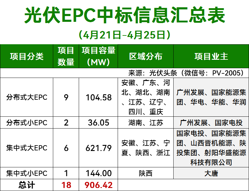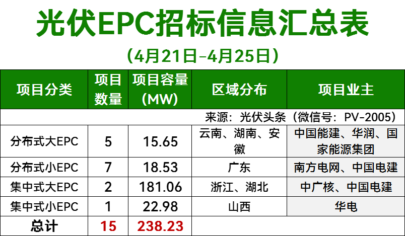 对4月第4周(4月21日-4月25日)光伏EPC招/中标项目公开信息不完全统计,本周招标规模合计238.23MW,中标规模合计906.42MW,招中标规模合计1144.65MW。