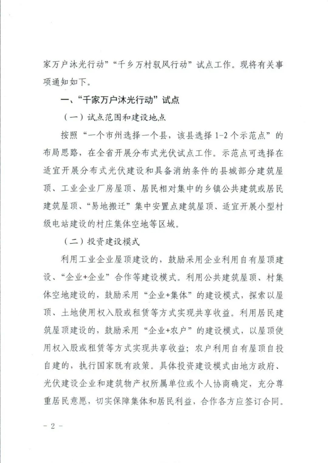 文件指出,千家万户沐光行动按照“一个市州选择一个县,该县选择1-2个示范点”的布局思路,在全省开展分布式光伏试点工作。示范点可选择在适宜开展分布式光伏建设和具备消纳条件的县城部分建筑屋顶、工业企业厂房屋顶、居民相对集中的乡镇公共建筑或居民建筑屋顶、“易地搬迁”集中安置点建筑屋顶、适宜开展小型村级电站建设的村庄集体空地等区域。