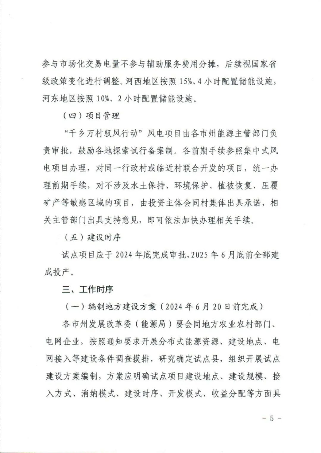 “千乡万村驭风行动”试点同样,每个市选择1个县,每个县选1-2个行政村。结合当地电网可承载能力,每个行政村规模不超过20兆瓦,由电网企业实施保障性并网,以就近就地消纳为主,上网电价按照并网当年新能源上网电价政策执行,鼓励参与市场化交易,参与市场化交易电量不参与辅助服务费用分摊,后续视国家省级政策变化进行调整。