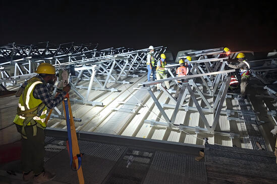 项目团队结合建筑实际结构,开展专项深化设计,并通过结构分析与施工优化,确保安装过程安全可控、稳定高效。面对朝向不一致、夜间高空作业难度大、50℃酷暑等重重挑战,项目团队采取流水线施工措施,分工明确、高效协同,有效保障了效率与质量“双达标”。