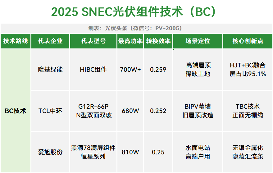 BC技术在SNEC 2025的上表现,已经证明其实现了从概念验证到量产竞速的蜕变。隆基、TCL中环、爱旭以效率突破+场景定制构筑差异化壁垒,而设备商的革新则破解量产瓶颈。